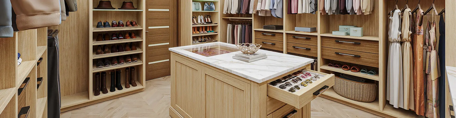 We assess your wardrobe, shoes, and accessories to create a personalized walk-in closet organization system tailored to your needs.