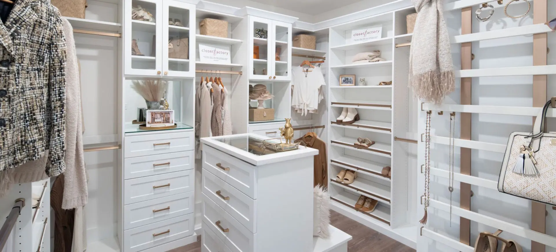 Bright white dressing room with hanging clothes, open shelving, and a drawer island.