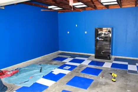 This client opted for Race-deck flooring tiles. The Closet Factory Installers came in and completed the floor in half of a day. The flooring was able to be cut around the safe that was bolted to the floor and the edges of the walls.