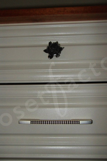 Mix and matching drawer handle hardware is one of my favorite design ideas. It is also an inexpensive way to modernize your custom closet or cabinetry design, and a great way to add your own unique touch. Check out these pictures featuring a beautiful master closet with brushed nickel hardware designed by Senior Designer Laurie Miller of Closet Factory Boston. When I asked her about this mix and match design trend she had this to say, “It’s just like jewelry, you don’t want everything to be too matchy-matchy. I collaborated with the client and suggested using different knobs or handles to create a unique design that not only looks stunning, but also brings out the personal style of the client.” This master closet design is made with our popular ivory melamine material and gives the built-in appearance of a painted wood design.