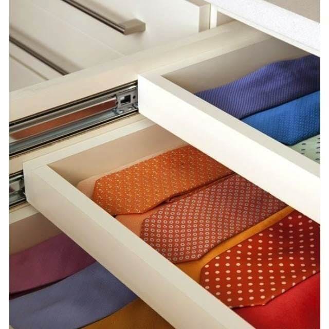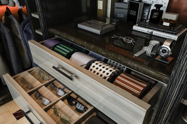 Maybe you’re a fan of rolling up your ties into a compact form and love to keep your collection closet together. Custom tie drawers feature pocket indents and racks where ties can be rolled up and kept in place. With multiple rows in each drawer, you could potentially keep a collection of 40 ties in three of them!