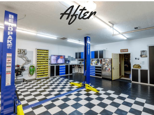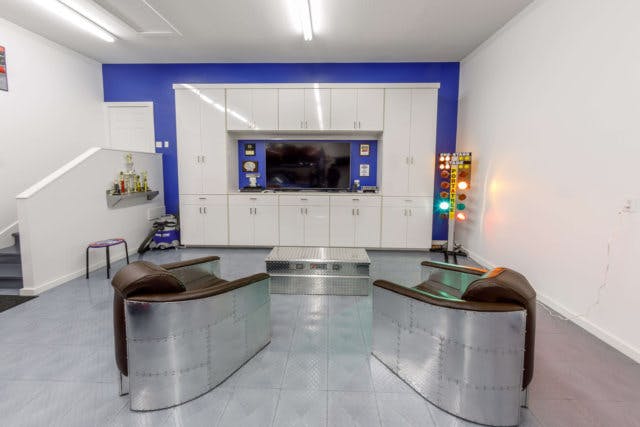 Julie continues: “The ‘work’ garage includes black and white race deck flooring, the Omni track slatwall, as well as a one 2-post vehicle lift to raise the car and be able to work underneath of it.”