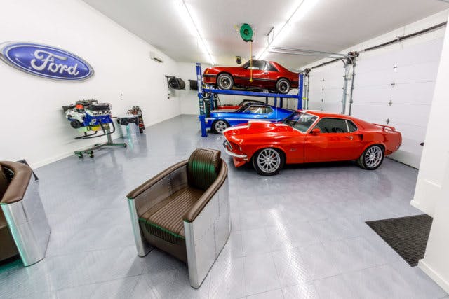 “The ‘Ford showroom garage’ includes two 4-post vehicle lifts for parking, aluminum color race deck flooring, a high gloss white media center, and a wall-mounted car vacuum.”