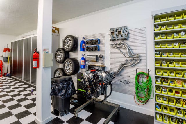 More than just a luxurious man cave, the second garage is also a functional, well-organized work space. Storing items like tires, hoses, and other equipment in designated sections allows the Wrights to find what they need for a project quickly and easily.