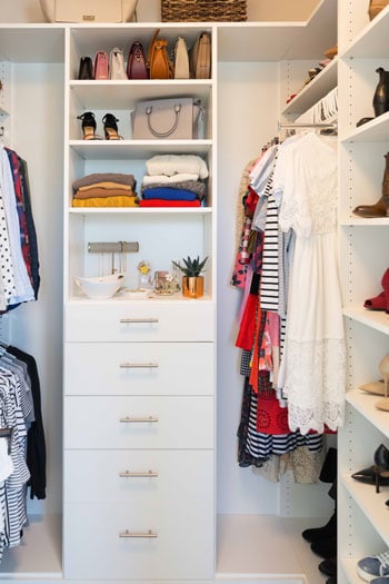 “One of the biggest challenges we faced with my new closet was how to store my purses. So my designer recommended we install shelves above my drawers. The shelves are all adjustable so you can move them up or down, and you can use them for displaying small items like purses,” said Merrick.