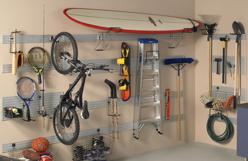 Slatwall is a flat display item with horizontal slats that you hang hooks and accessories on based on your wants and needs. You can see find slatwall in our commercial retail design spaces used to display items and can easily be changed and re arranged to suit what the store wants to display. Slatwall is also used in our garage designs to hang tools and accessories.